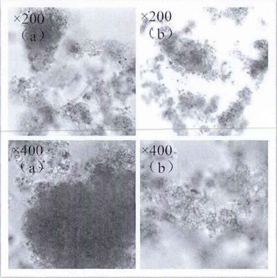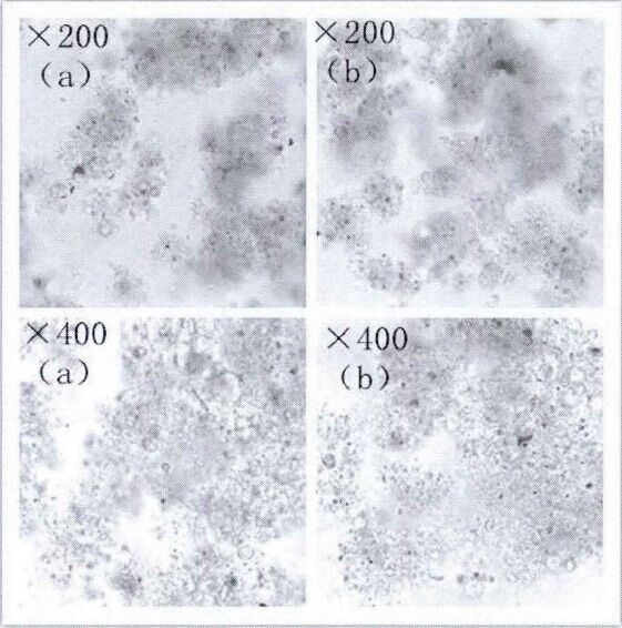 剩余污泥浓度较高,在显微镜下都难以分辨,因此,将破解前后的剩余污泥均稀释3倍后进行观测。图1和图2显示的是高压均质破解前和150MPa破解后的污泥稀释3倍后,在X200和X400分辨率下的观测图(a)和(b)指两个不同污泥样品。从两图可以看出剩余污泥未经高压均质破解时,呈团状,颗粒大,观测过程中发现,微生物活动较为活跃。当污泥经高压均质破解后,团状、大颗粒性物质被破碎成小颗粒、细小的物质,同时观测到微生物活动有所降低。因此,高压均质作用能够有效地破解剩余污泥,且能破碎大部分微生物。