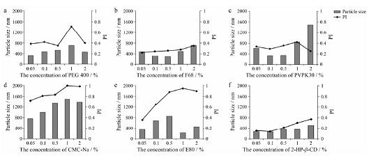 图1不同稳定剂PDC纳米混悬液的平均粒径和PI值比较